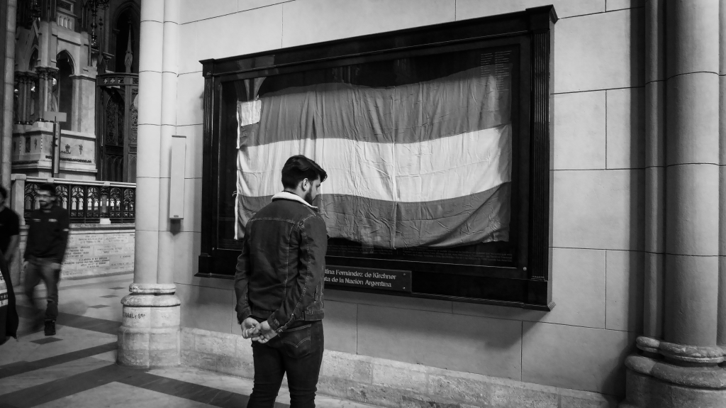 Rara costumbre latinoamericana de mezclar nacionalismo, política y religión. En el templo se exhibe la bandera empleada por un grupo de argentinos durante el «Operativo Cóndor» en 1966, acción armada que pretendió devolver la soberanía de las islas Malvinas.