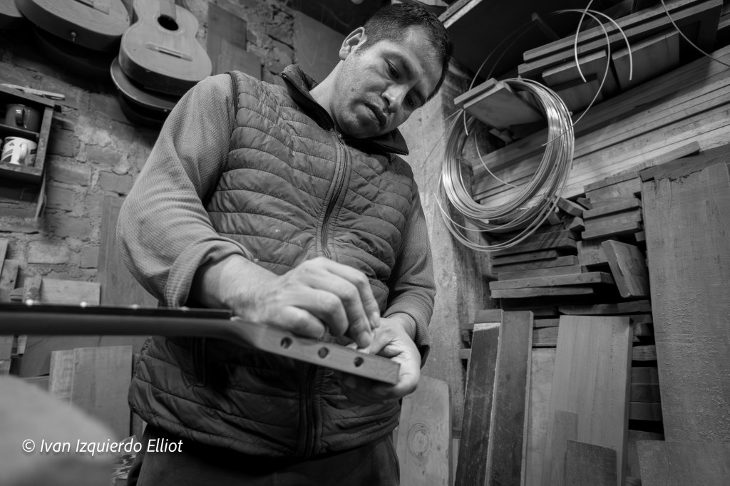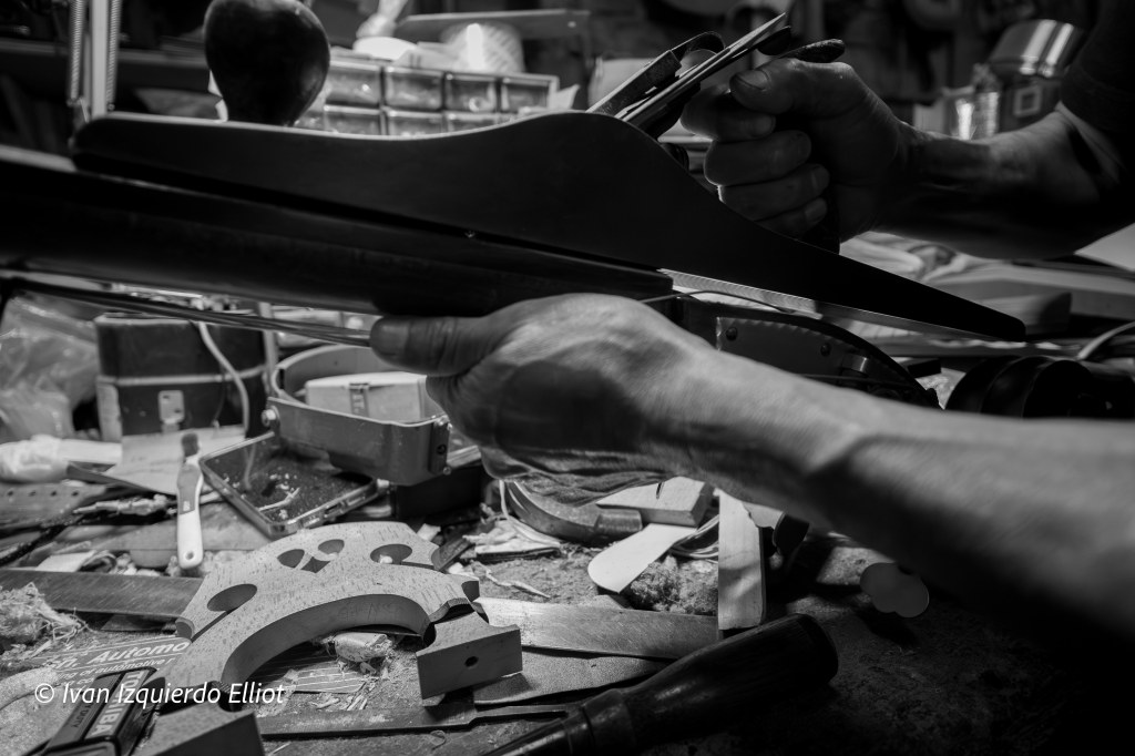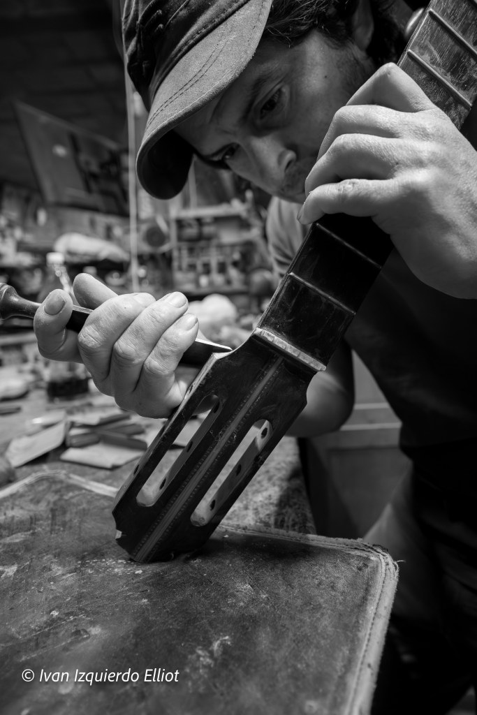 La garlopa muerde el fino ébano del diapasón. Con mano firme y confiado en su vasta experiencia, el luthier efectúa la delicada maniobra. Con suaves y rítmicas pasadas, la afilada hoja afeita pequeñas virutas del costoso ébano. No hay mucho lugar para el error.