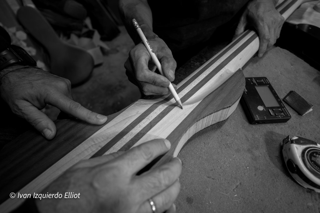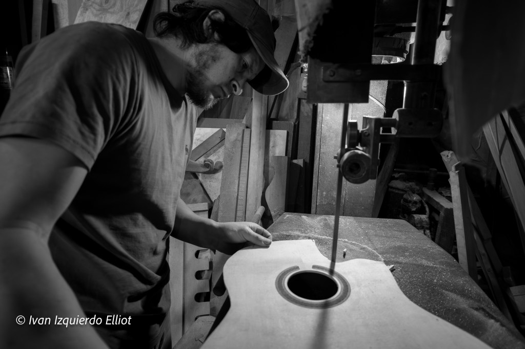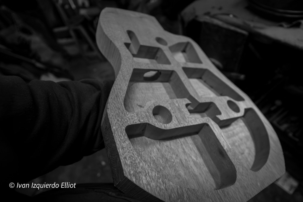 La sierra de cinta llena el templo con su potente ulular, es difícil hablar. Los rápidos dientes de la larga hoja desgarran la madera del cuerpo de la guitarra guiada con precisión —en mis manos de aficionado constituiría un absoluto desastre— pienso. El corte sigue el contorno del trazo a lápiz y el cordófono toma otra forma, más femenina, más sensual. La música también es imagen, forma, tacto. Cada instrumento está destinado a crear sonidos y también admiración.