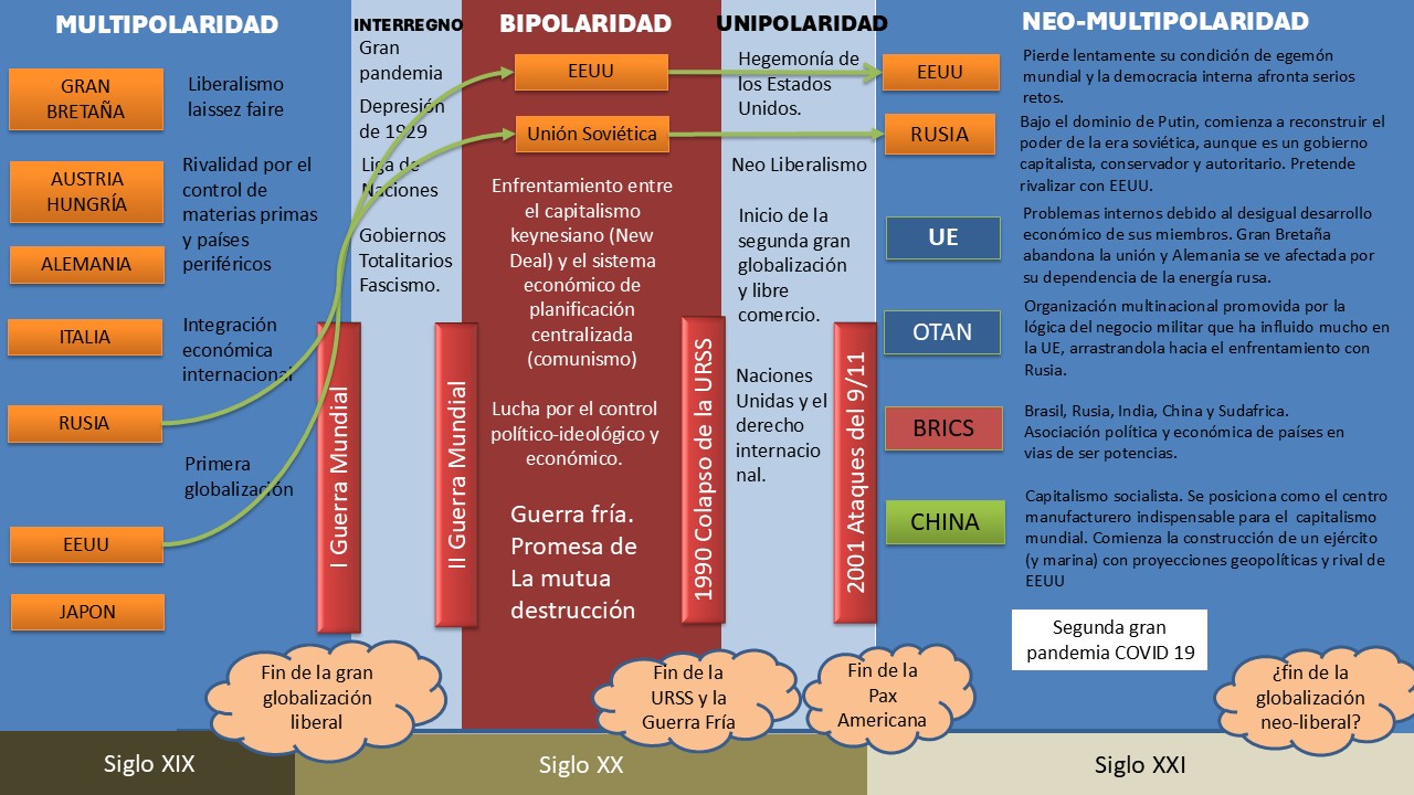 En el grafico a continuación se aprecia la sucesión de periodos, desde finales del siglo XIX (Periodo de multipolaridad), inicio del siglo XX (Cuando se inició la IGM), el interregno de entre guerras (surgimiento de gobiernos totalitarios), el inicio de la IIGM (Entendida como una continuación de la IGM), el período de la bipolaridad de la guerra fría, la unipolaridad marcada por la caída de la URSS y el inicio del breve período de la pax americana, y el inicio de la neo multipolaridad de hoy.