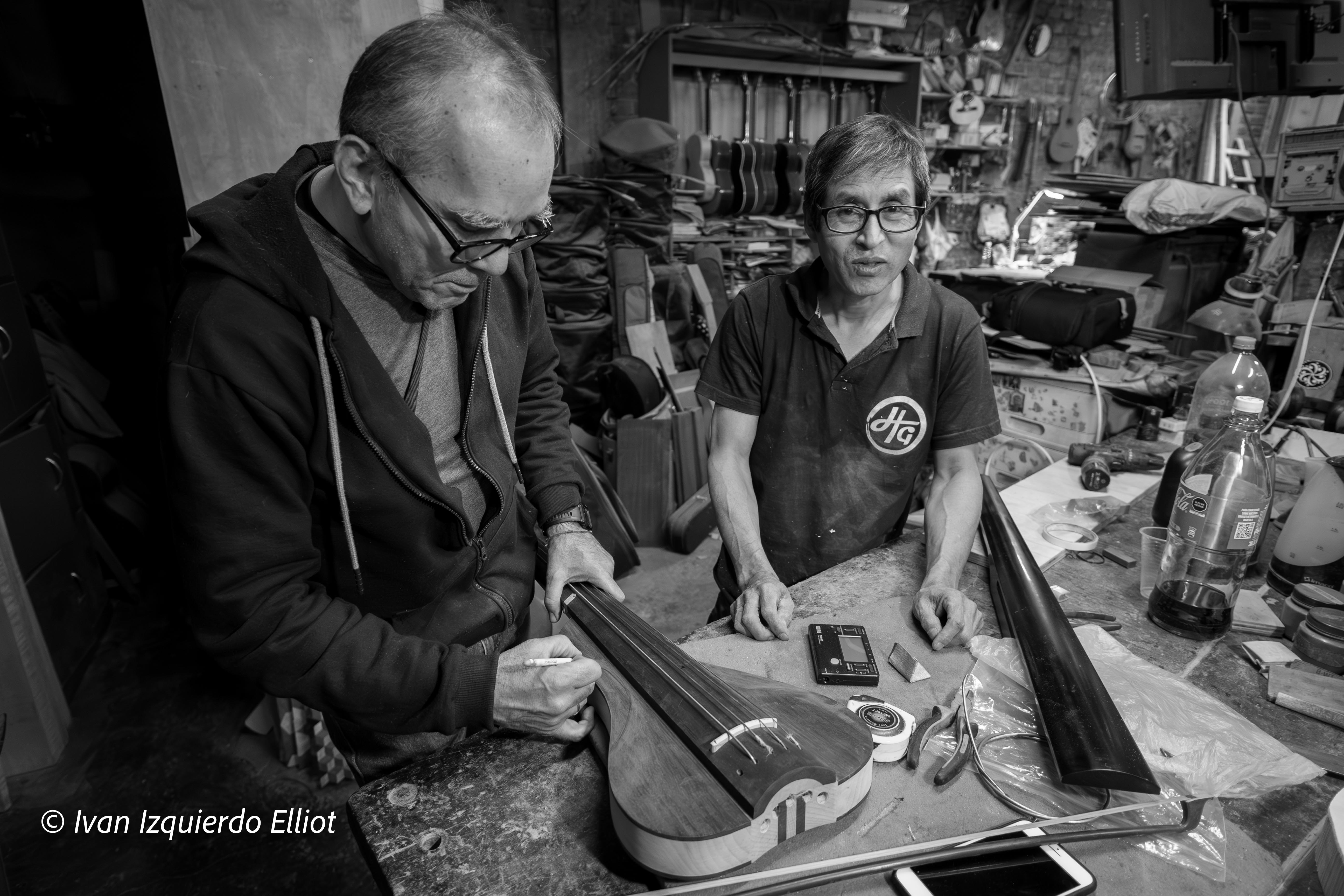 La sierra de cinta llena el templo con su potente ulular, es difícil hablar. Los rápidos dientes de la larga hoja desgarran la madera del cuerpo de la guitarra guiada con precisión —en mis manos de aficionado constituiría un absoluto desastre— pienso. El corte sigue el contorno del trazo a lápiz y el cordófono toma otra forma, más femenina, más sensual. La música también es imagen, forma, tacto. Cada instrumento está destinado a crear sonidos y también admiración.