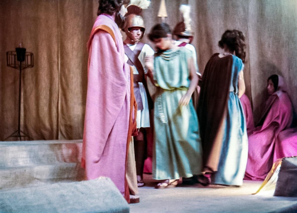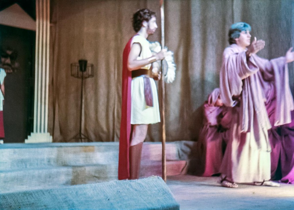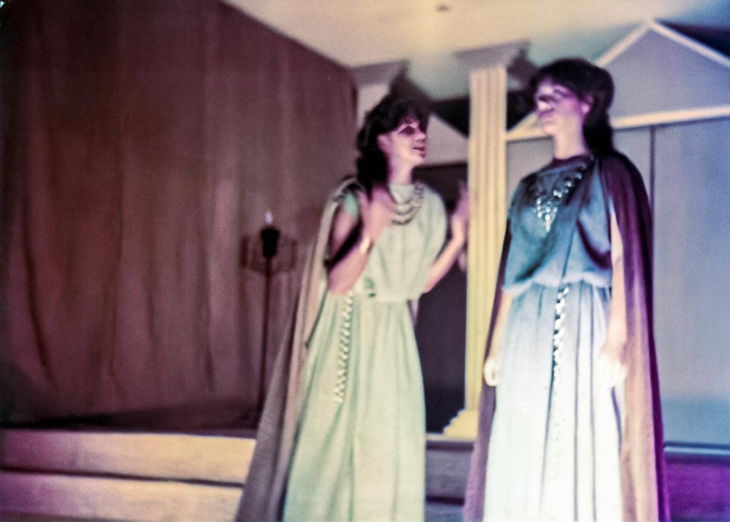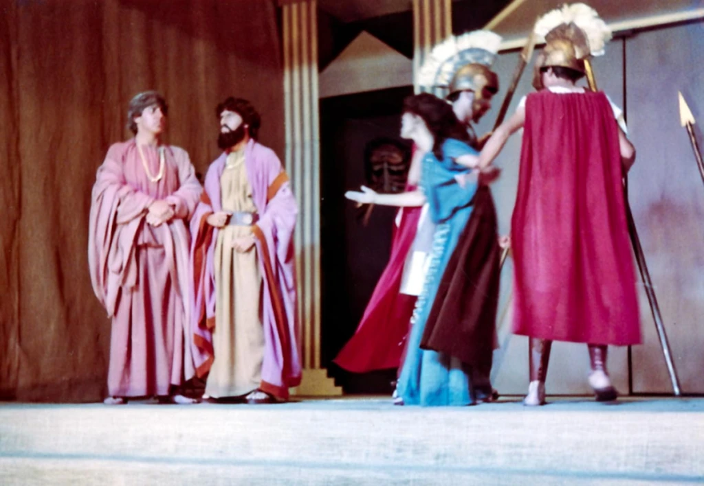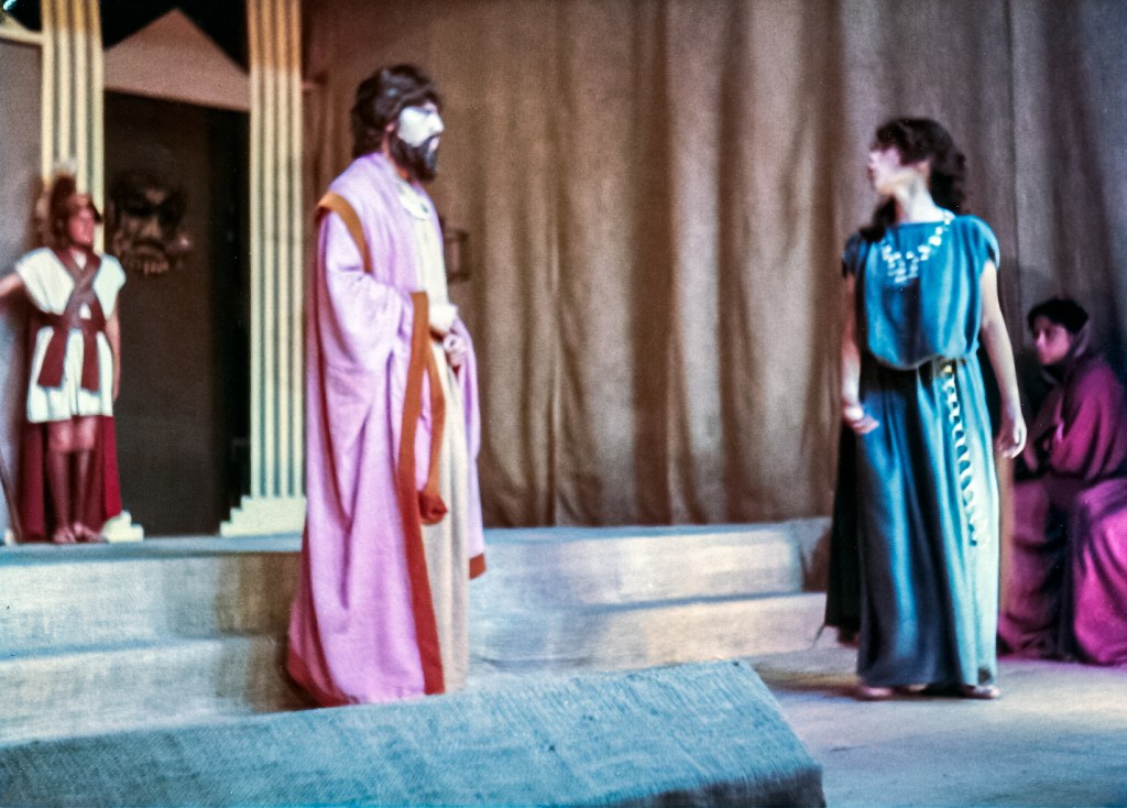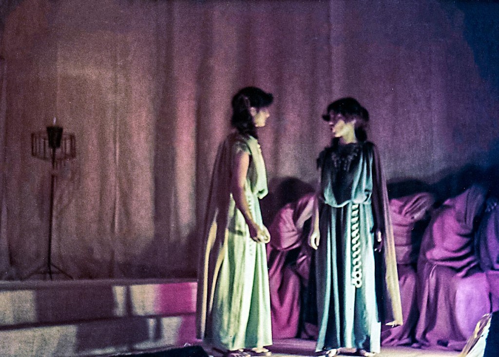 Una anécdota: mis hermanos menores se quedaban junto a mí fuera de hora de clases, mientras ensayábamos. Es así, cómo el profesor que andaba en la búsqueda de un niño para que hiciera el papel del lazarillo para acompañar a José Quiróz (el anciano Tiresias) que interpretó al sabio ciego del pueblo. De entre los niños, escogió a mi hermano Miguel, de 1er grado de primaria, quien terminaba todo sucio y sudoroso después de jugar en el patio. El día de la actuación, el profesor le indicó a mi mami: “—Sra. Cristina, no lo vaya a bañar, su interpretación es de un niño pobre del pueblo, así con su olor de niño sucio está perfecto—”. Llegó el día del estreno, yo interpreté a Ismena, la hermana de Antígona, a quien trataba de disuadir para que no desafíe la ley del orden cívico y lo divino, por rendir honores a su hermano muerto quien era considerado un traidor; desafío que, finalmente, la llevó a la muerte.