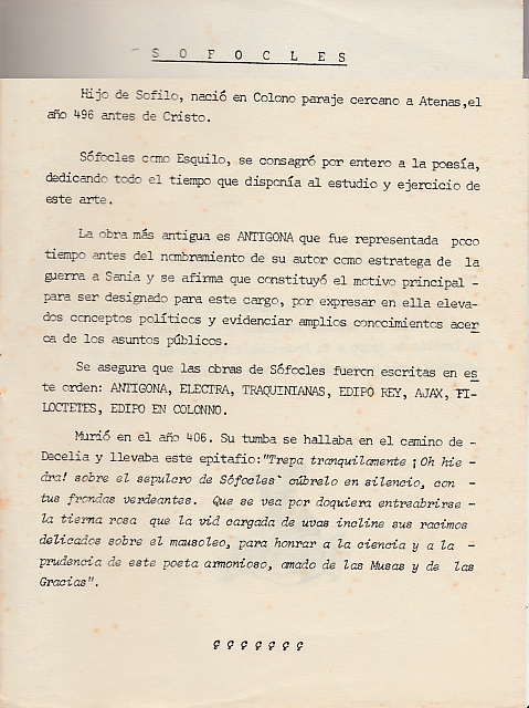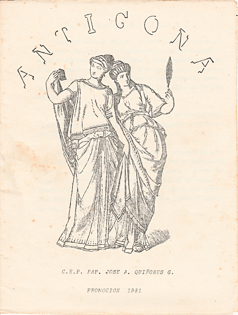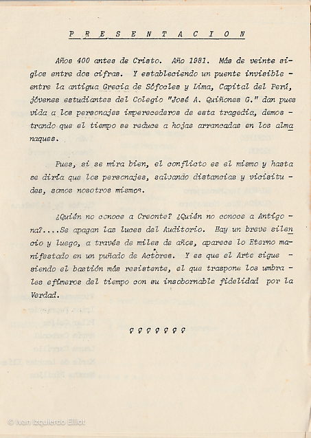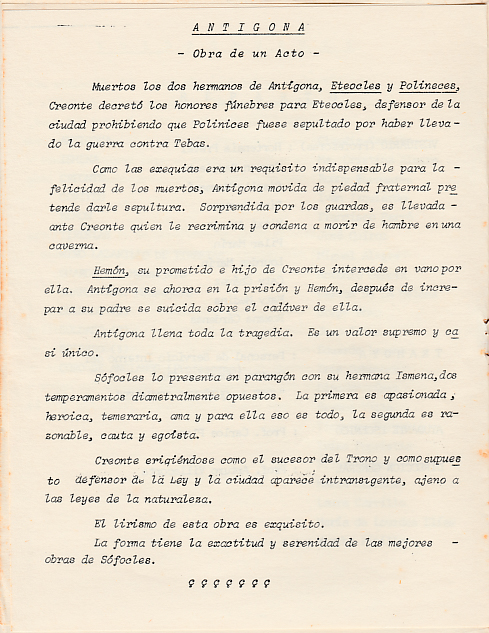 Es difícil evocar los lejanos recuerdos de la obra Antígona, que se remontan tantos años atrás. Sin embargo, los que subsisten constituyen gratos momentos guardados con nostalgia; la oportunidad única, donde un grupo de alumnos escolares nos transformamos en actores, bajo la dirección de un gran artista como lo fue nuestro profesor Arturo Villacorta. Ha sido una increíble sorpresa encontrar la cajita, de esas que las chicas guardamos celosamente cuando atravesamos la adolescencia, en la que intenté preservar mis mejores recuerdos. Y allí estaba, el guion de la obra Antígona, el mismo que me dio el profesor Villacorta. Recuerdo cando me dijo: “Apréndelo. Practícalo hasta que lo sepas de memoria”.