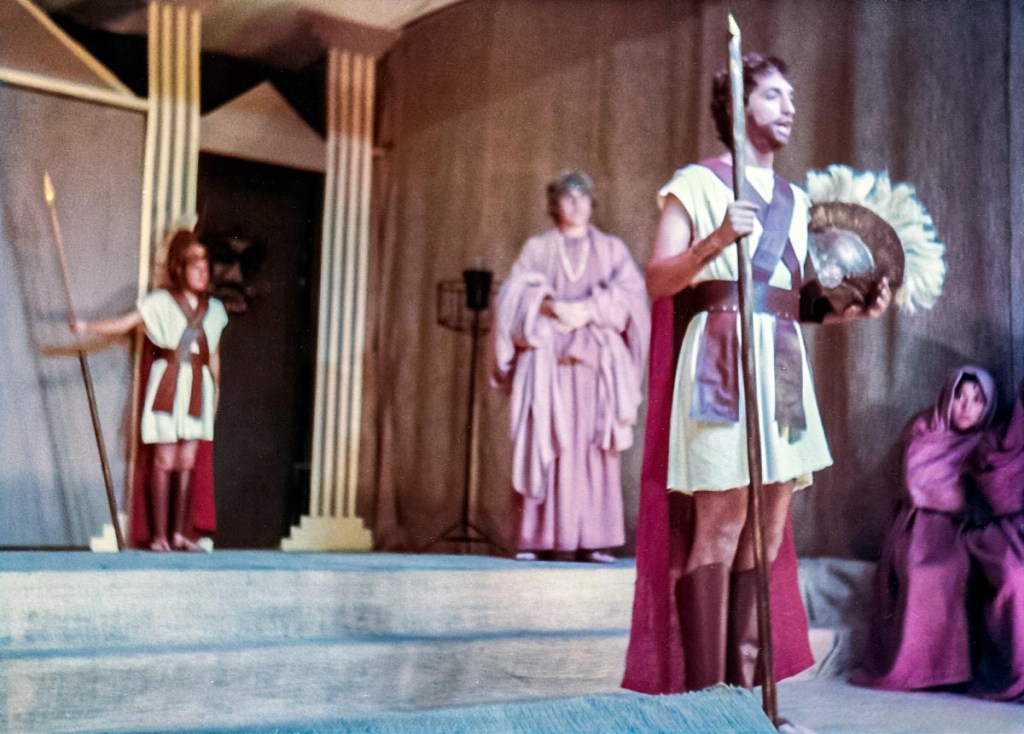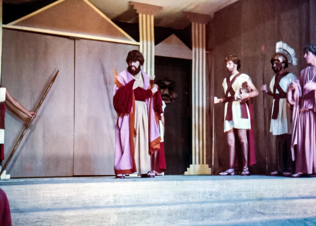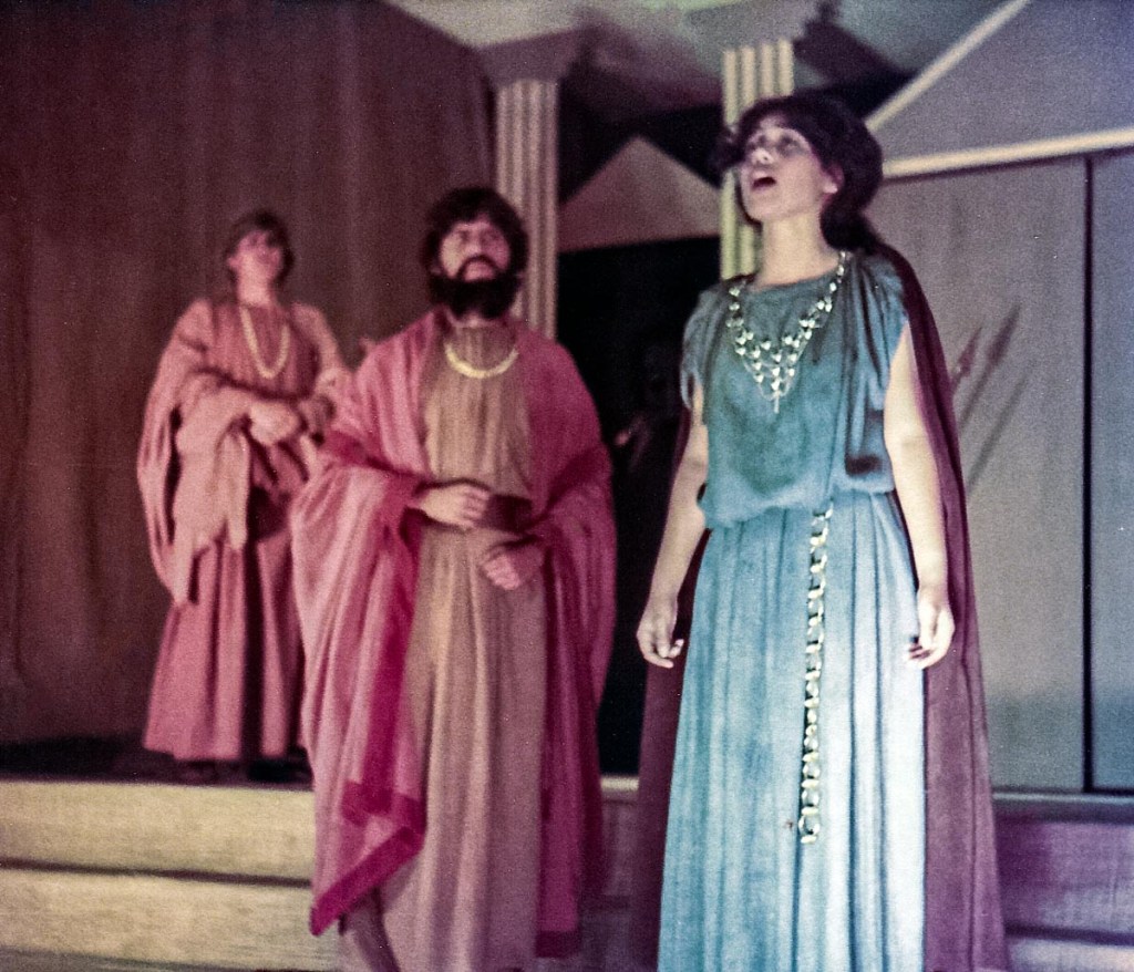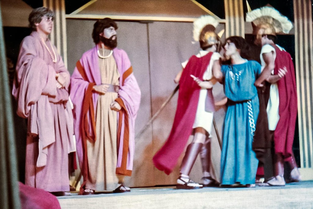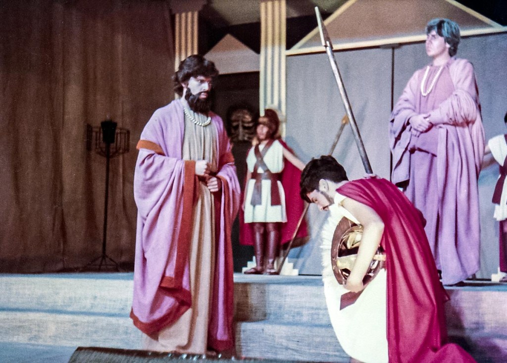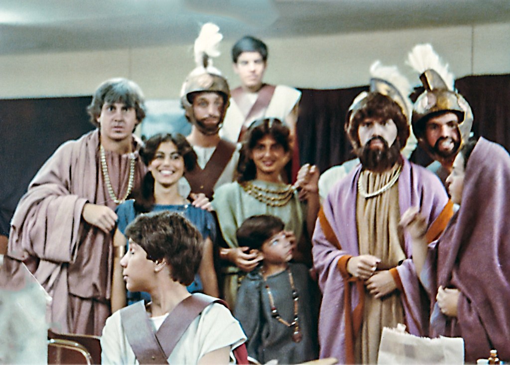 Con presentaciones musicales, bailes del Perú y del Mundo, evocando todas las épocas, como la escenificación de la Creación del Mundo, pasajes bíblicos; todo un reto puesto en escena, increíble el manejo de las luces y sonido, ni que decir de los cambios de escenario. Llegué a 5to de secundaria, después de participar por años en los musicales, el “Maestro” nos reunió a un grupo de la promoción 81 para proponernos una presentación de teatro, invitando a Ronny de la promoción 80 (exalumno) y a Claudia de la promoción 82. ¡Qué tal reto que nos propuso! ¡“Antígona”, una tragedia griega! Por primera vez enfrentamos al público externo, aprendimos el guion y declamamos utilizando nuestra sola fuerza de voz para interpretar un drama griego. Lo que más me impactó fue el vestuario, compuesto por vestidos de yute teñido, los mismos que con los juegos de luces, parecían trajes de terciopelo, los trajes de los guardias, las túnicas de los personajes de esa época. También la participación de las profesoras en el coro que fueron el complemento ideal de la obra.