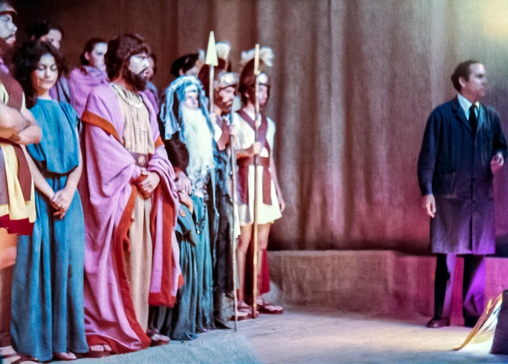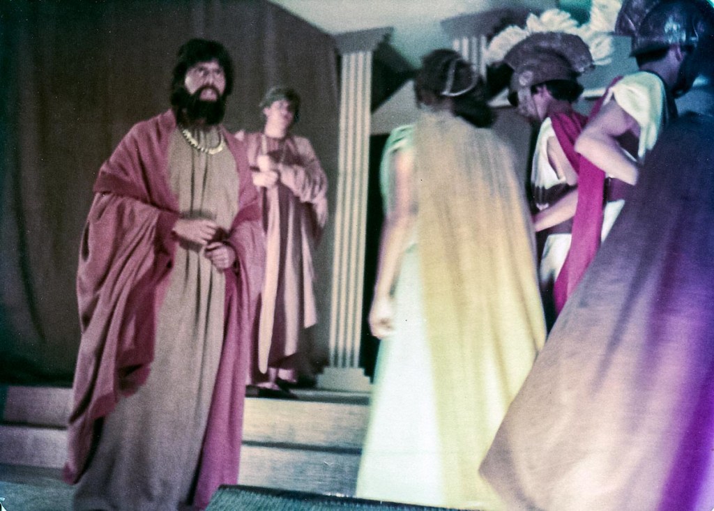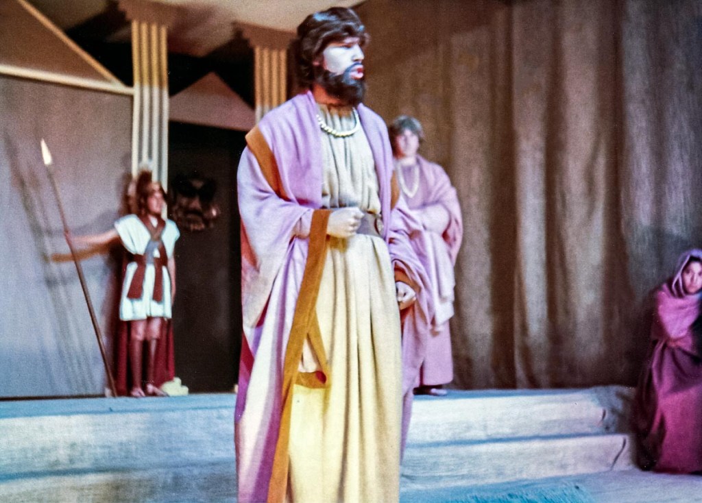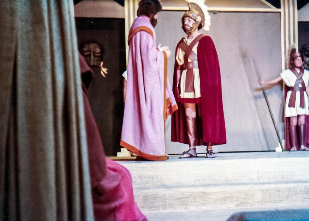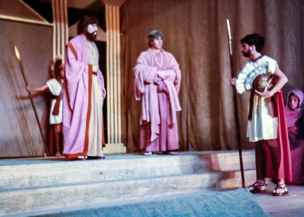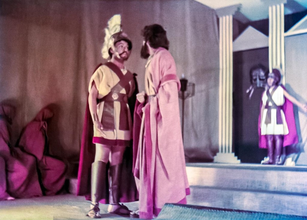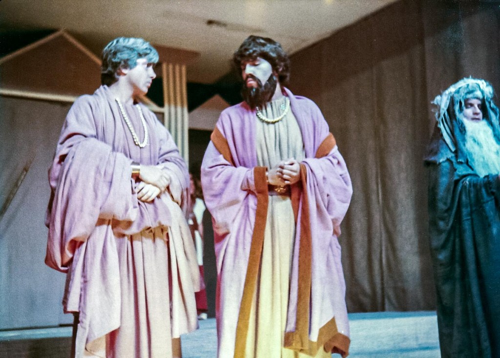 Con presentaciones musicales, bailes del Perú y del Mundo, evocando todas las épocas, como la escenificación de la Creación del Mundo, pasajes bíblicos; todo un reto puesto en escena, increíble el manejo de las luces y sonido, ni que decir de los cambios de escenario. Llegué a 5to de secundaria, después de participar por años en los musicales, el “Maestro” nos reunió a un grupo de la promoción 81 para proponernos una presentación de teatro, invitando a Ronny de la promoción 80 (exalumno) y a Claudia de la promoción 82. ¡Qué tal reto que nos propuso! ¡“Antígona”, una tragedia griega! Por primera vez enfrentamos al público externo, aprendimos el guion y declamamos utilizando nuestra sola fuerza de voz para interpretar un drama griego. Lo que más me impactó fue el vestuario, compuesto por vestidos de yute teñido, los mismos que con los juegos de luces, parecían trajes de terciopelo, los trajes de los guardias, las túnicas de los personajes de esa época. También la participación de las profesoras en el coro que fueron el complemento ideal de la obra.