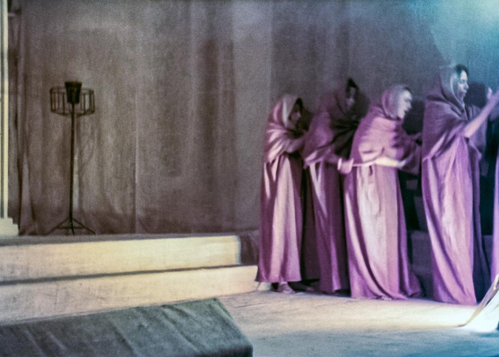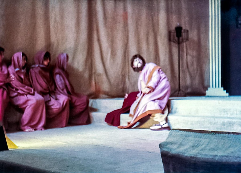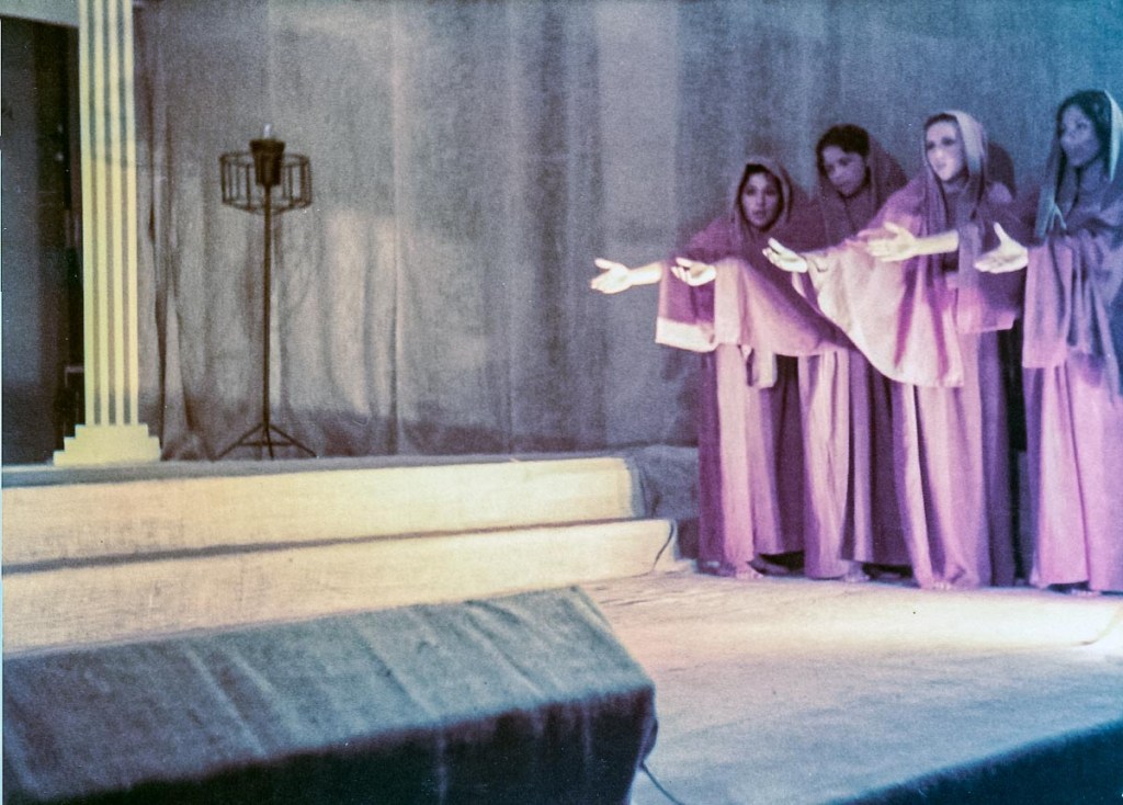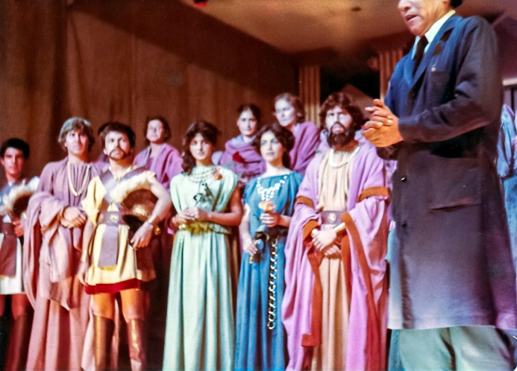 Recuerdo que hicimos varios ensayos bajo la permanente dirección de Arturo, enseñando, exigiendo y perfeccionándonos a cada momento, enseñándonos a hablar claro y fuerte, ya que la presentación de la obra sería en nuestro pequeño auditorio del colegio, sin otra ayuda que nuestras desacostumbradas gargantas. “¡No sonrían! —nos decía— ¡esta es una tragedia!”. Ensayamos y ensayamos hasta que nos aprendimos los parlamentos. El día de la actuación, estábamos vestidos con ropa de la época hecha de grueso yute teñido. Maikiti (Ismena) y yo nos maquillamos para vernos mejor, y el profesor Villacorta nos dijo con voz de trueno: —¡no están yendo a ninguna fiesta!, se supone que están sufriendo. ¡Quítense ese maquillaje de inmediato!— Se han borrado muchos recuerdos de la presentación en sí, posiblemente por la gran presión a la que estábamos sometidos; pero si me acuerdo de que, al final, una vez consumado la representación, nos aplaudieron muchísimo. Esa obra fue un momento importante en mi vida. Aprendí a tener disciplina, a trabajar en grupo, a compartir momentos y a expresarme sin miedo. Es el hermoso legado del profesor Villacorta. A través de su arte nos regaló, a todos los que tuvimos la fortuna de tenerlo en el colegio, el don de la expresión y exteriorizar, sin miedo, lo mejor que tenemos en nosotros. Antígona no fue lo único que hizo, él estuvo detrás de cada actuación del día de la madre o de navidad y de muchas más.
