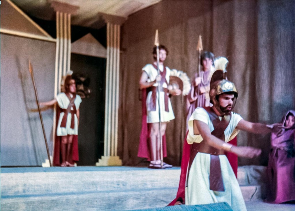 Recuerdo como si fuese ayer su gran dilema para obtener un reóstato. Arturo no imaginaba una iluminación ad hoc a la obra, sin la capacidad de regular la intensidad de la luz —»imposible lograr el efecto dramático de la escena si la luz no cambia progresivamente» —habla el experimentado profesional lleno de entusiasmo. Construyó en madera los cajones que soportaron las lámparas que sirvieron como baterías superiores, candilejas y diablas; la escenografía y los altillos con los que se representó el palacio de Tebas. Con la ayuda de mis diligentes compañeras y profesoras crearon el vestuario que debía transportarnos más de veinte siglos en el tiempo. Otro grupo de entusiastas educadoras del colegio conformaron el “coro de ancianos”, con entusiasmo, entrega y mucho humor. Dato curioso, los papeles protagónicos de Antígona y Creonte, fueron interpretados por jóvenes que no pertenecieron a la promoción. Arturo seleccionó a Claudia Canales (promoción 1982) y a Ronny Barrantes (promoción 1980) por sus innatos talentos para las tablas. Ambos ejecutaron una magnífica e inolvidable interpretación. No me olvido de mis queridos compañeros de elenco quienes con arrojo (hay que tener valor para lanzarse a un escenario), responsabilidad y compromiso, actuaron magníficamente.