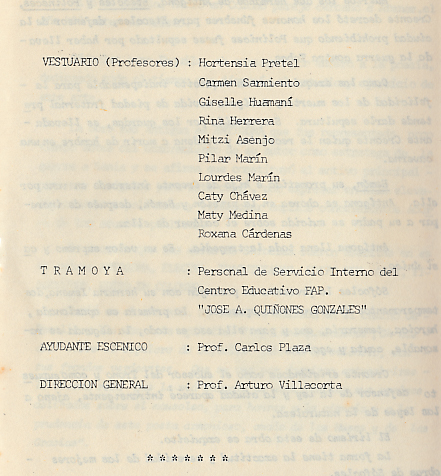 Hace poco tiempo me enteré del fallecimiento de Arturo Villacorta, uno de los profesores que marcó mi paso por la secundaria especialmente. Desgraciadamente la vida nos fue llevando por lejanos caminos y jamás pude conversar con el nuevamente. Sin embargo, guardé las fotografías que mi madre tomó durante la presentación de la obra, el guion original y el programa. Pero principalmente, atesoré el mejor recuerdo de tan bello proyecto cuya memoria se niega a perderse en la niebla del tiempo. Cuarenta y tres años es bastante; sin embargo, la emoción, el nerviosismo, las vestimentas, las tramoyas, las candilejas de madera que Arturo construyó y hasta el peculiar olor del escenario y el maquillaje, siguen vivos en mi memoria. Cuando alguien fallece, la principal pérdida es la oportunidad para agradecer lo que hizo por nosotros.